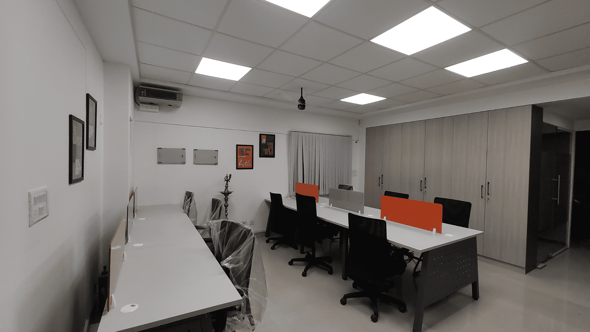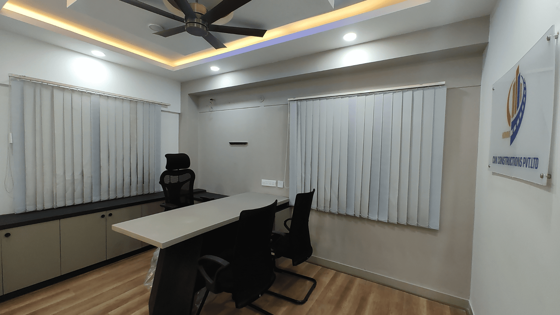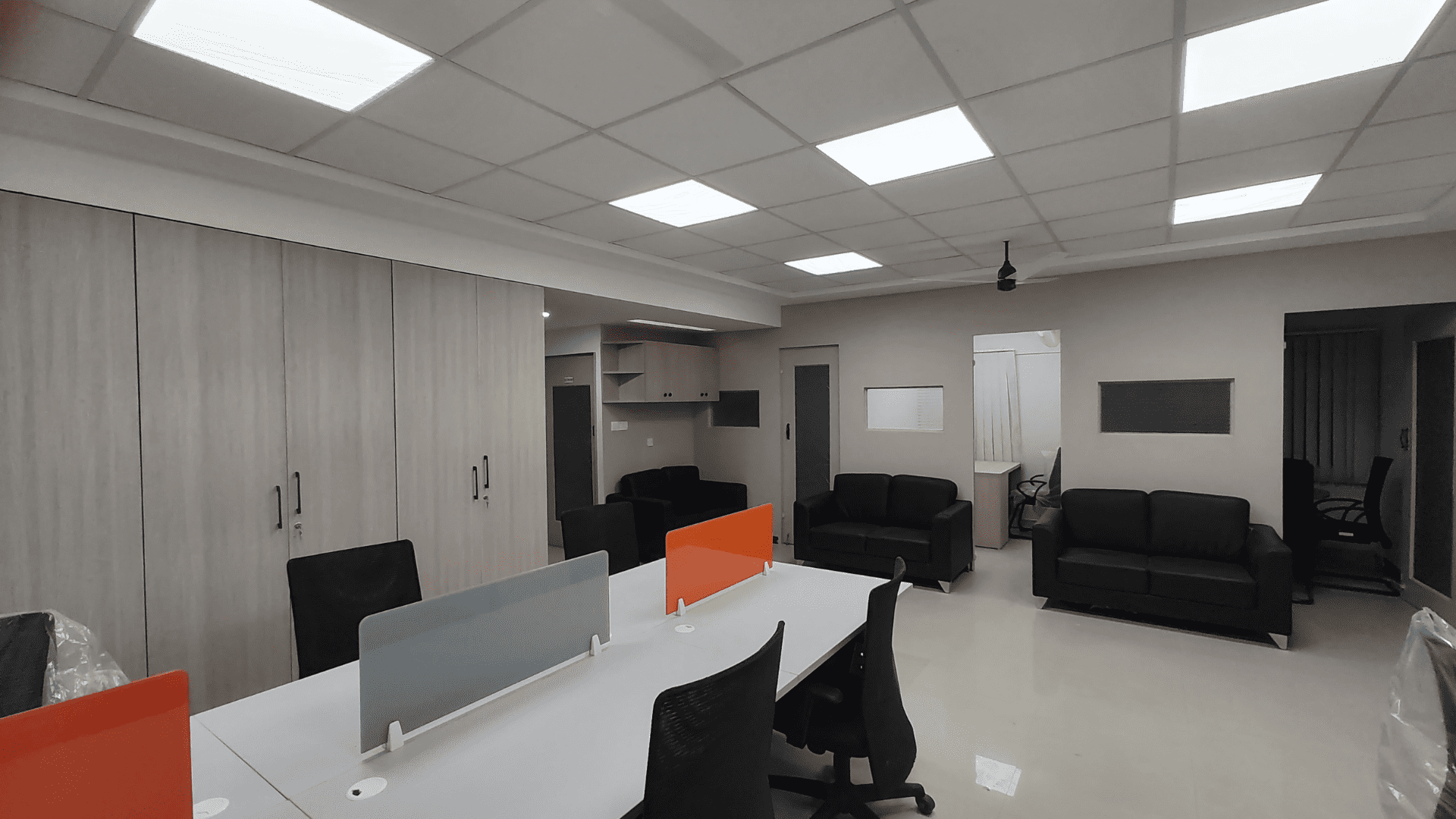 The office layout was meticulously planned to accommodate both the construction and accounts teams. A luxury MD cabin was crafted, featuring opulent furnishings and a sophisticated ambiance. Grid ceilings and modular workstations were employed for an organized and efficient workspace. To infuse the office with the brand's identity, wardrobes in a vibrant orange color, matching the logo, were incorporated.