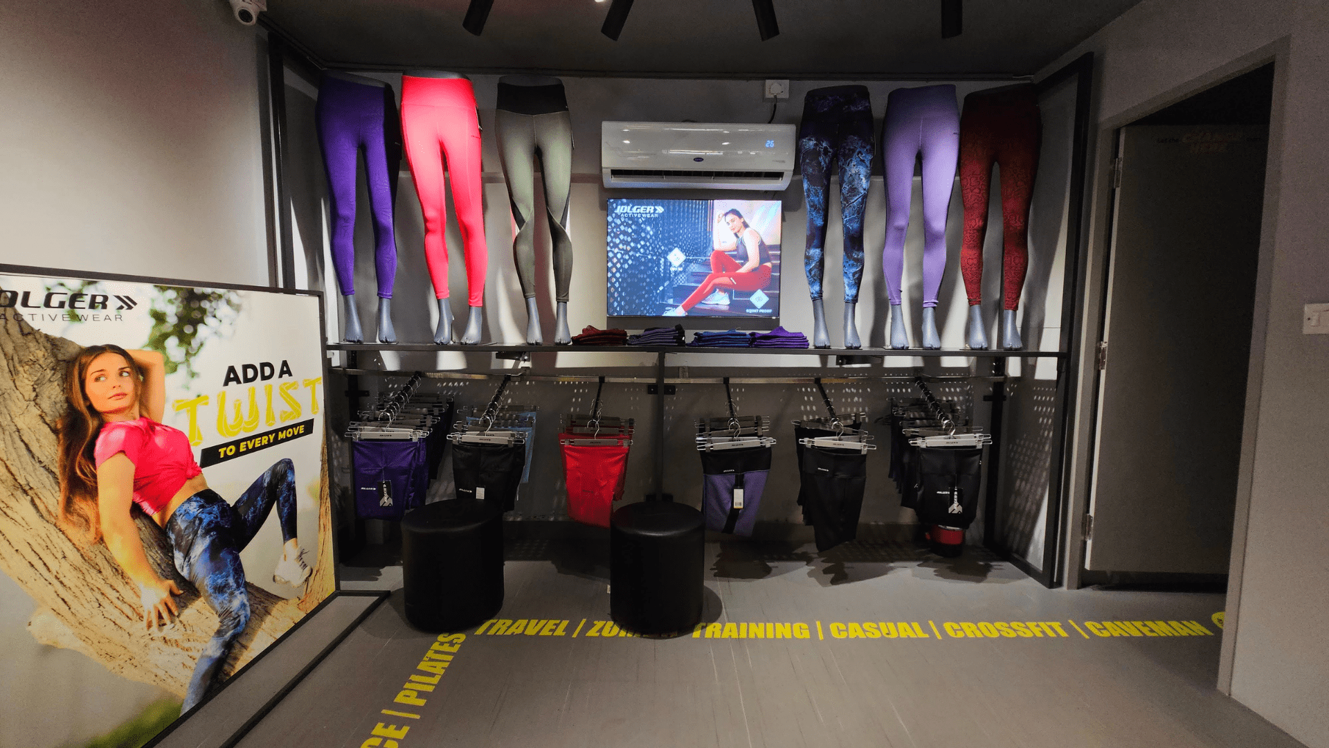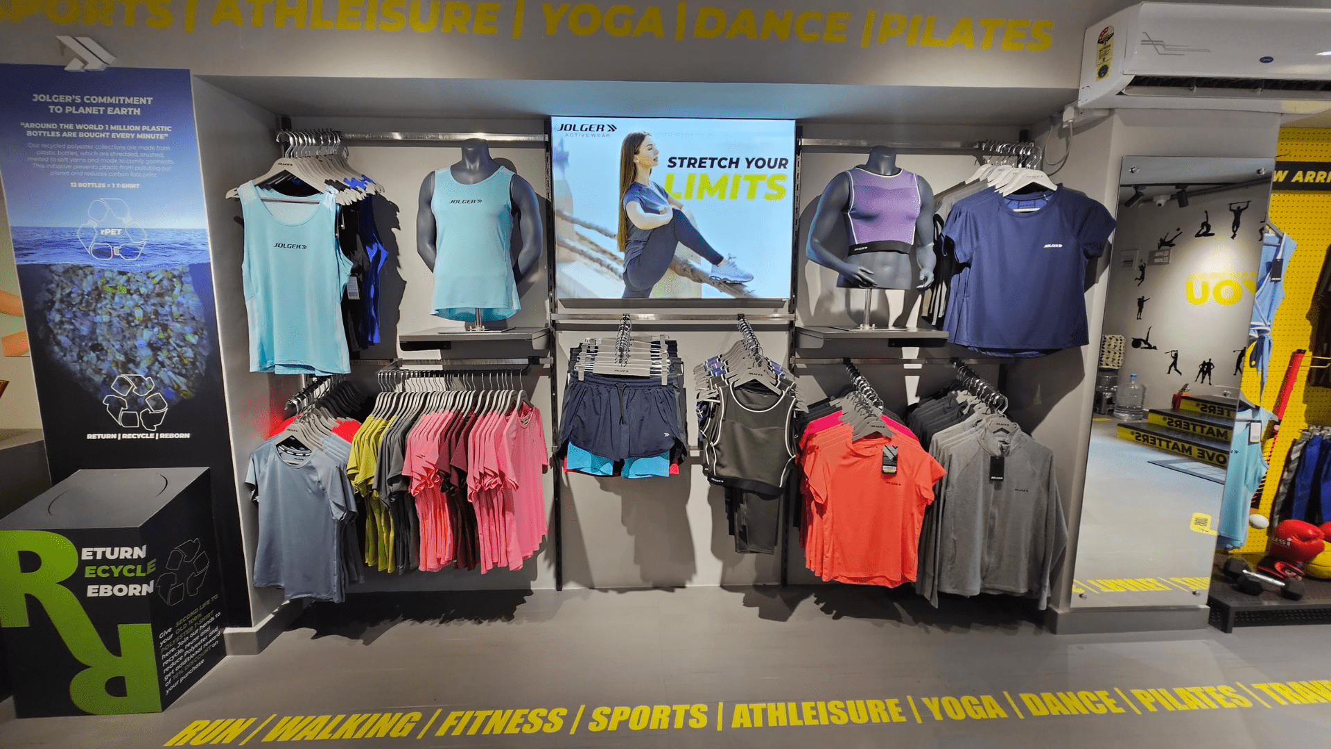 To maximize space efficiency and flexibility, Make It Build incorporated modular adjustable racks, allowing for both vertical and horizontal configurations. This design not only enhances the store's functionality but also provides a visually appealing display for Jolger's diverse range of athleisure clothing.