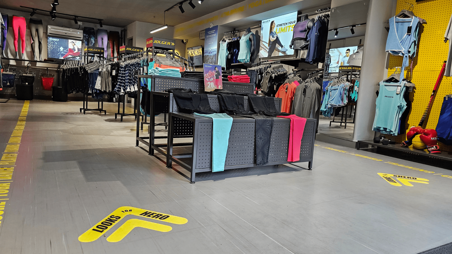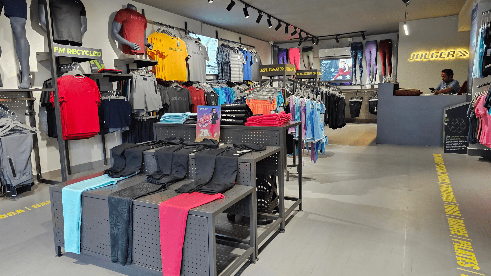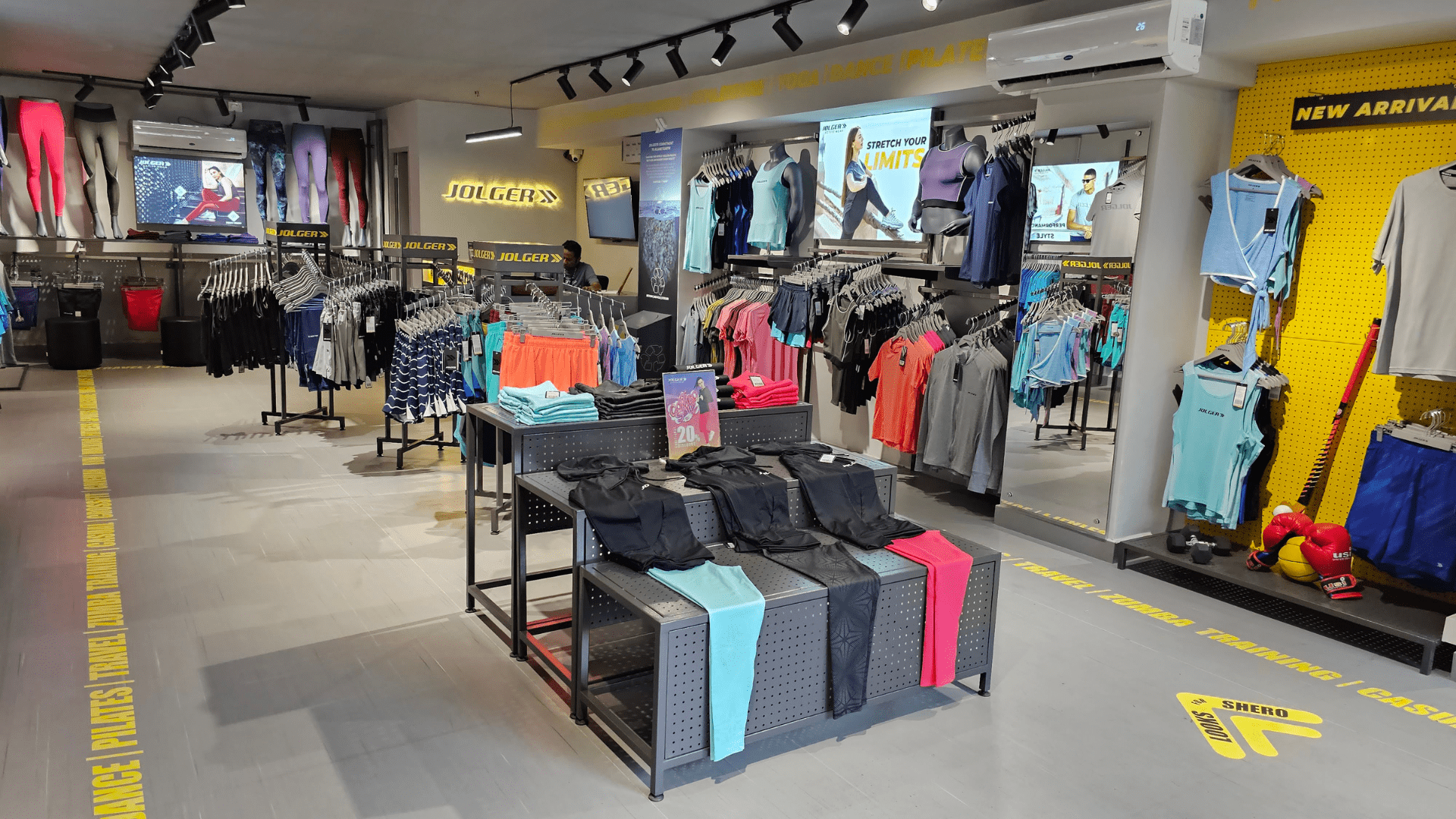 Jolger, an emerging athleisure brand, envisioned its debut retail outlet in the vibrant district of Koramangala, Bangalore. Collaborating with Make It Build, they aimed to set new standards in retail design while staying ahead of competitors. The store, meticulously designed, features a sleek grey palette with vibrant yellow accents, creating a dynamic atmosphere that aligns with the brand's ethos.